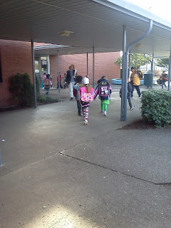 Bus 250 apparently had a malfunction. It arrived after the last bell. Off the bus bounces my Vivian. Happy as ever to see me, as if she hadn't seen me just a short time before when I walked away from the bus stop. I got my Vivian hug, and off she trotted towards the land of first graders, my utterly independant girl (when she wants to be).